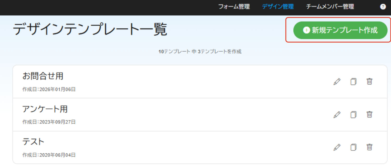 1.フォーム一覧画面より、該当フォームの「デザイン設定」をクリックします。