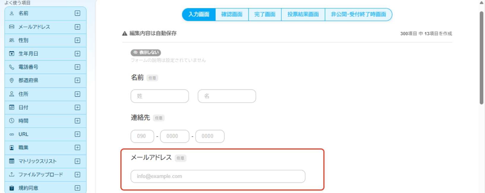 1.「フォーム編集」画面にて「メールアドレス」項目を設置します。