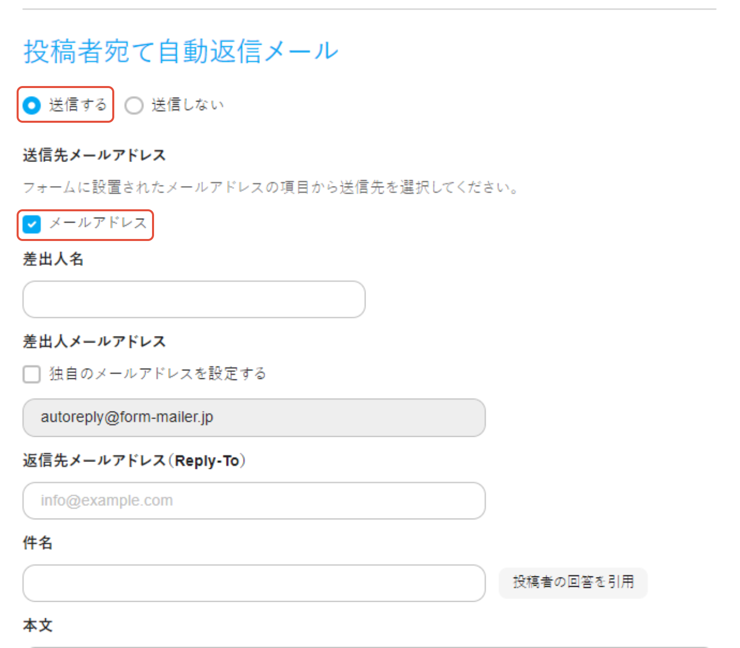 フォームメーラーではプランに関わらず、フォームの投稿者に送信する「自動返信メール」を設定できます。ご利用には、必ず下記の設定を行ってください。