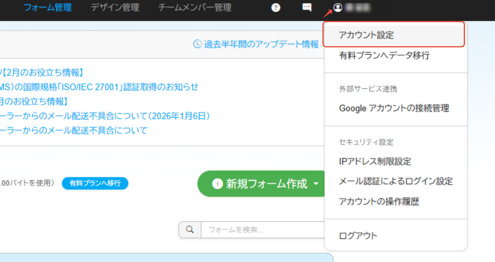 1.管理画面の右上のアイコンをクリックして、「アカウント設定」をクリックしてください。