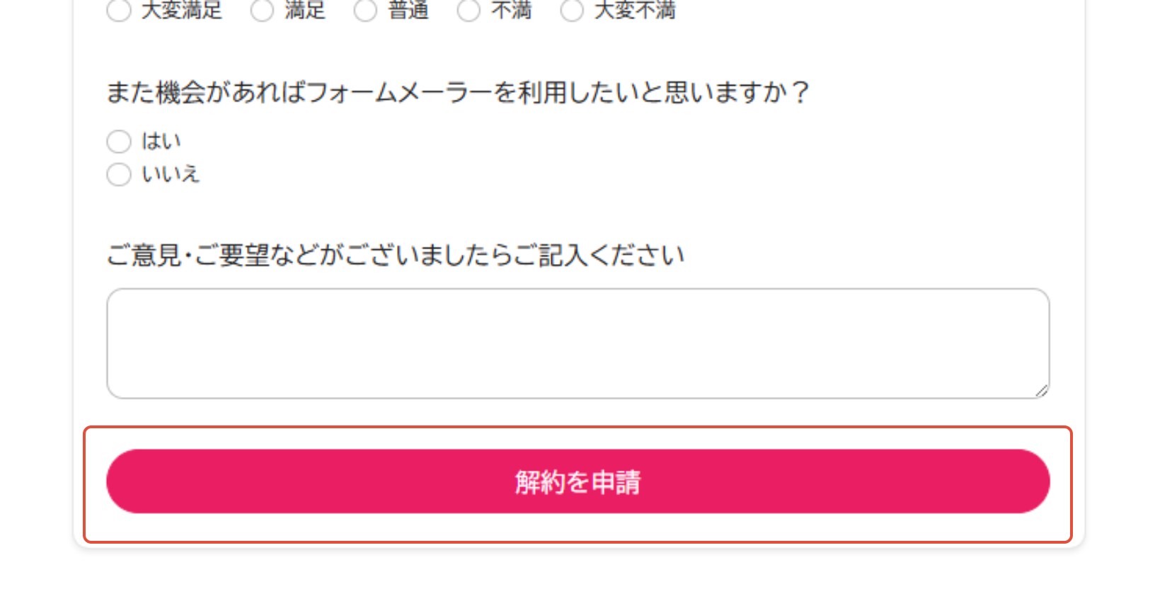 3.解約申請画面にて、アンケートが表示されます。アンケートにご回答のうえ、画面下部の「解約を申請」ボタンをクリックしてください。