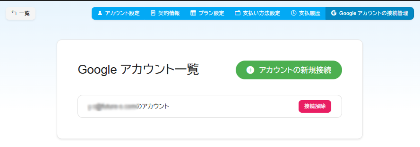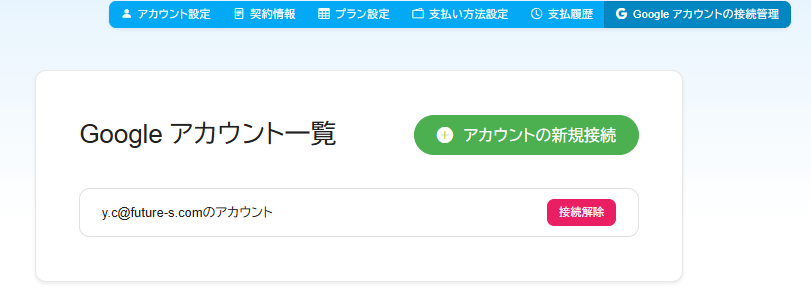 「Googleアカウントの接続管理」 より、「接続解除」ボタンをクリックすれば、フォームメーラーアカウントとGoogleアカウントとの接続を解除できます。