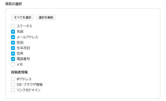 2.「項目の選択」にエクスポートしたい項目にチェックが入っていないか